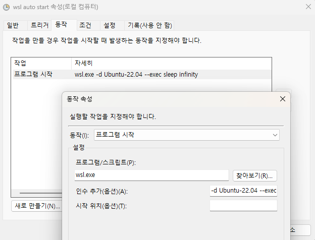 동작탭은 아래와 같이 프로그램에는 "wsl.exe"를, 인자에는 "-d Ubuntu-22.04 --exec sleep infinity"를 넣는다. 여기서 Ubuntu-22.04는 시스템에 설치된 linux 이름과 동일하게 변경해서 입력한다.